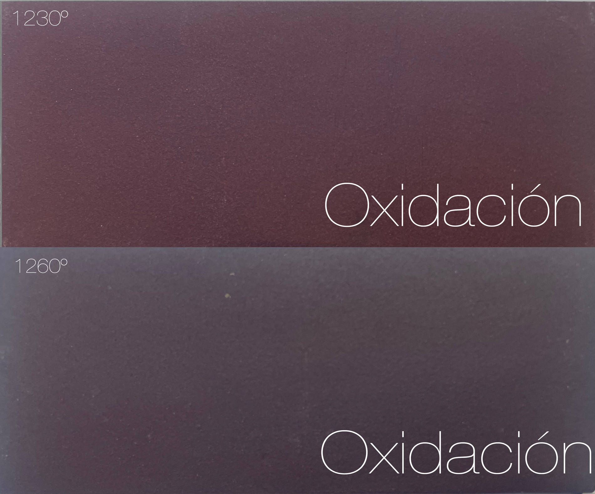 Color rojo oscuro a 1240°C, y un rojo burdeos a 1260°C.